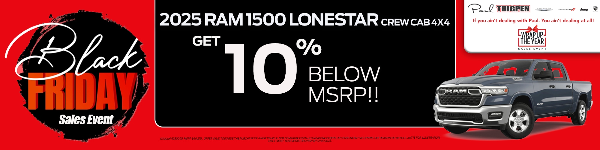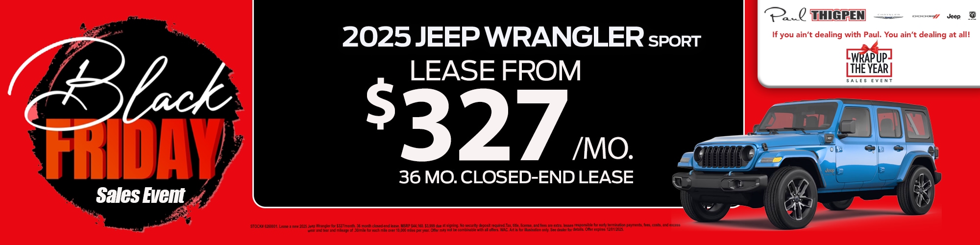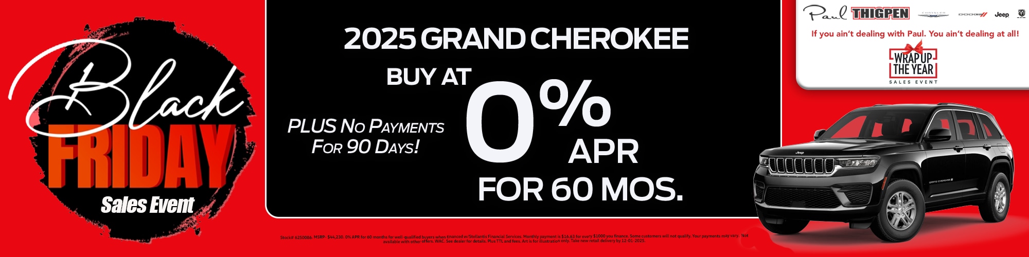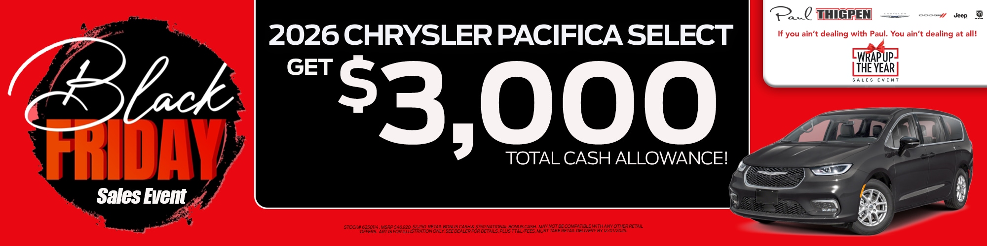 Discover the latest new vehicle specials at Paul Thigpen CDJR in Waynesboro, GA. From powerful RAM trucks to adventurous Jeep SUVs, stylish Chrysler models, and bold Dodge vehicles, our featured offers make it easier to drive home a brand-new ride at a price that fits your budget.