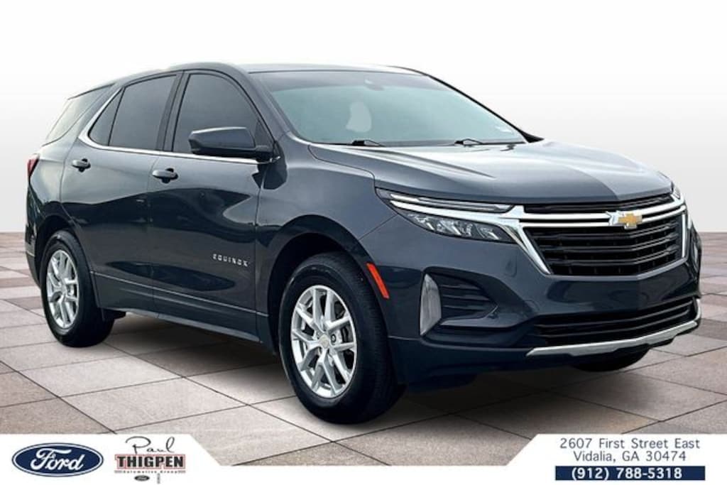 Vidalia Ford Lincoln 2607 E 1st St Vidalia, Georgia 30474 912-788-5318 Preferred Equipment Group 1LT, Ford Blue Advantage: Blue Certified Certified, AWD, 17" Aluminum Wheels, 2 Rear USB Charging-Only Ports, 2 USB Ports & Auxiliary Input Jack, 2-Way Power Driver Lumbar Control Seat Adjuster, 3.87 Final Drive Axle Ratio, 4-Wheel Disc Brakes, 6 Speakers, 6-Speaker Audio System Feature, ABS brakes, Air Conditioning, Alloy wheels, AM/FM radio: SiriusXM, Auto High-beam Headlights, Bluetooth® For Phone, Brake assist, Bumpers: body-color, Compass, Delay-off headlights, Deleted 3 Years of Remote Access, Driver 8-Way Power Seat Adjuster, Driver door bin, Driver vanity mirror, Dual front impact airbags, Dual front side impact airbags, Electronic Stability Control, Emergency communication system: OnStar and Chevrolet connected services capable, Four wheel independent suspension, Front anti-roll bar, Front Bucket Seats, Front Center Armrest, Front Passenger 4-Way Manual Seat Adjuster, Front reading lights, Fully automatic headlights, Heated door mirrors, Illuminated entry, Low tire pressure warning, Occupant sensing airbag, Outside temperature display, Overhead airbag, Overhead console, Panic alarm, Passenger door bin, Passenger vanity mirror, Power door mirrors, Power driver seat, Power steering, Power windows, Premium audio system: Chevrolet Infotainment 3, Premium Cloth Seat Trim, Radio data system, Radio: Chevrolet Infotainment 3 System w/AM/FM, Rear anti-roll bar, Rear reading lights, Rear seat center armrest, Rear window defroster, Rear window wiper, Remote keyless entry, Security system, SiriusXM Radio, Speed control, Speed-sensing steering, Split folding rear seat, Spoiler, Steering wheel mounted audio controls, Tachometer, Telescoping steering wheel, Tilt steering wheel, Traction control, Trip computer, Variably intermittent wipers, and Wireless Apple CarPlay/Wireless Android Auto. Iron Gray Metallic 2023 Chevrolet Equinox LT AWD 1.5L DOHC AWD, 17" Aluminum Wheels, 2 Rear USB Charging-Only Ports, 2 USB Ports & Auxiliary Input Jack, 2-Way Power Driver Lumbar Control Seat Adjuster, 3.87 Final Drive Axle Ratio, 4-Wheel Disc Brakes, 6 Speakers, 6-Speaker Audio System Feature, ABS brakes, Air Conditioning, Alloy wheels, AM/FM radio: SiriusXM, Auto High-beam Headlights, Bluetooth® For Phone, Brake assist, Bumpers: body-color, Compass, Delay-off headlights, Deleted 3 Years of Remote Access, Driver 8-Way Power Seat Adjuster, Driver door bin, Driver vanity mirror, Dual front impact airbags, Dual front side impact airbags, Electronic Stability Control, Emergency communication system: OnStar and Chevrolet connected services capable, Four wheel independent suspension, Front anti-roll bar, Front Bucket Seats, Front Center Armrest, Front Passenger 4-Way Manual Seat Adjuster, Front reading lights, Fully automatic headlights, Heated door mirrors, Illuminated entry, Low tire pressure warning, Occupant sensing airbag, Outside temperature display, Overhead airbag, Overhead console, Panic alarm, Passenger door bin, Passenger vanity mirror, Power door mirrors, Power driver seat, Power steering, Power windows, Preferred Equipment Group 1LT, Premium audio system: Chevrolet Infotainment 3, Premium Cloth Seat Trim, Radio data system, Radio: Chevrolet Infotainment 3 System w/AM/FM, Rear anti-roll bar, Rear reading lights, Rear seat center armrest, Rear window defroster, Rear window wiper, Remote keyless entry, Security system, SiriusXM Radio, Speed control, Speed-sensing steering, Split folding rear seat, Spoiler, Steering wheel mounted audio controls, Tachometer, Telescoping steering wheel, Tilt steering wheel, Traction control, Trip computer, Variably intermittent wipers, Wireless Apple CarPlay/Wireless Android Auto.