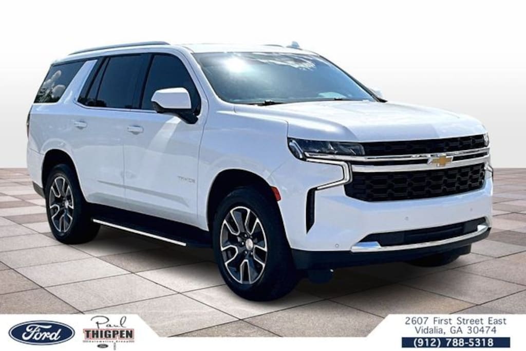 Vidalia Ford Lincoln 2607 E 1st St Vidalia, Georgia 30474 912-788-5318 Preferred Equipment Group 1LS (1st & 2nd Row Color-Keyed Carpeted Floor Mats, Color-Keyed Carpeting Floor Covering, Driver & Front Outboard Passenger Airbags, Floor Console w/Storage Area, LED Daytime Running Lamps, Remote Start, SiriusXM Radio w/360L, and Wrapped Steering Wheel), Ford Blue Advantage: Blue Certified Certified, Black Cloth, 3.23 Rear Axle Ratio, 3rd row seats: split-bench, 4-Wheel Disc Brakes, 6 Speakers, 6-Speaker Audio System Feature, ABS brakes, Air Conditioning, Alloy wheels, AM/FM radio: SiriusXM with 360L, Apple CarPlay/Android Auto, Auto High-beam Headlights, Automatic temperature control, Brake assist, Bumpers: body-color, Compass, Delay-off headlights, Driver door bin, Driver vanity mirror, Dual front impact airbags, Dual front side impact airbags, Electronic Stability Control, Emergency communication system: OnStar and Chevrolet connected services capable, Four wheel independent suspension, Front anti-roll bar, Front Bucket Seats, Front Center Armrest, Front dual zone A/C, Front High-Back Reclining Bucket Seats, Front reading lights, Fully automatic headlights, Heated door mirrors, Illuminated entry, Infotainment Display, Low tire pressure warning, Occupant sensing airbag, Outside temperature display, Overhead airbag, Overhead console, Panic alarm, Passenger door bin, Passenger vanity mirror, Power door mirrors, Power driver seat, Power passenger seat, Power steering, Power windows, Premium Cloth Seat Trim, Premium Smooth Ride Suspension, Radio: Chevrolet Infotainment 3 System, Rain sensing wipers, Rear air conditioning, Rear anti-roll bar, Rear reading lights, Rear seat center armrest, Rear window defroster, Rear window wiper, Remote keyless entry, Roof rack: rails only, Security system, Speed control, Speed-sensing steering, Split folding rear seat, Spoiler, Steering wheel mounted audio controls, Tachometer, Telescoping steering wheel, Tilt steering wheel, Traction control, Trip computer, Variably intermittent wipers, Voltmeter, Wheels: 18" x 8.5" Bright Silver Painted Aluminum, and Wheels: 20" x 9" Painted Aluminum. Summit White 2023 Chevrolet Tahoe LS RWD EcoTec3 5.3L V8 Black Cloth, 1st & 2nd Row Color-Keyed Carpeted Floor Mats, 3.23 Rear Axle Ratio, 3rd row seats: split-bench, 4-Wheel Disc Brakes, 6 Speakers, 6-Speaker Audio System Feature, ABS brakes, Air Conditioning, Alloy wheels, AM/FM radio: SiriusXM with 360L, Apple CarPlay/Android Auto, Auto High-beam Headlights, Automatic temperature control, Brake assist, Bumpers: body-color, Color-Keyed Carpeting Floor Covering, Compass, Delay-off headlights, Driver & Front Outboard Passenger Airbags, Driver door bin, Driver vanity mirror, Dual front impact airbags, Dual front side impact airbags, Electronic Stability Control, Emergency communication system: OnStar and Chevrolet connected services capable, Floor Console w/Storage Area, Four wheel independent suspension, Front anti-roll bar, Front Bucket Seats, Front Center Armrest, Front dual zone A/C, Front High-Back Reclining Bucket Seats, Front reading lights, Fully automatic headlights, Heated door mirrors, Illuminated entry, Infotainment Display, LED Daytime Running Lamps, Low tire pressure warning, Occupant sensing airbag, Outside temperature display, Overhead airbag, Overhead console, Panic alarm, Passenger door bin, Passenger vanity mirror, Power door mirrors, Power driver seat, Power passenger seat, Power steering, Power windows, Preferred Equipment Group 1LS, Premium Cloth Seat Trim, Premium Smooth Ride Suspension, Radio: Chevrolet Infotainment 3 System, Rain sensing wipers, Rear air conditioning, Rear anti-roll bar, Rear reading lights, Rear seat center armrest, Rear window defroster, Rear window wiper, Remote keyless entry, Remote Start, Roof rack: rails only, Security system, SiriusXM Radio w/360L, Speed control, Speed-sensing steering, Split folding rear seat, Spoiler, Steering wheel mounted audio